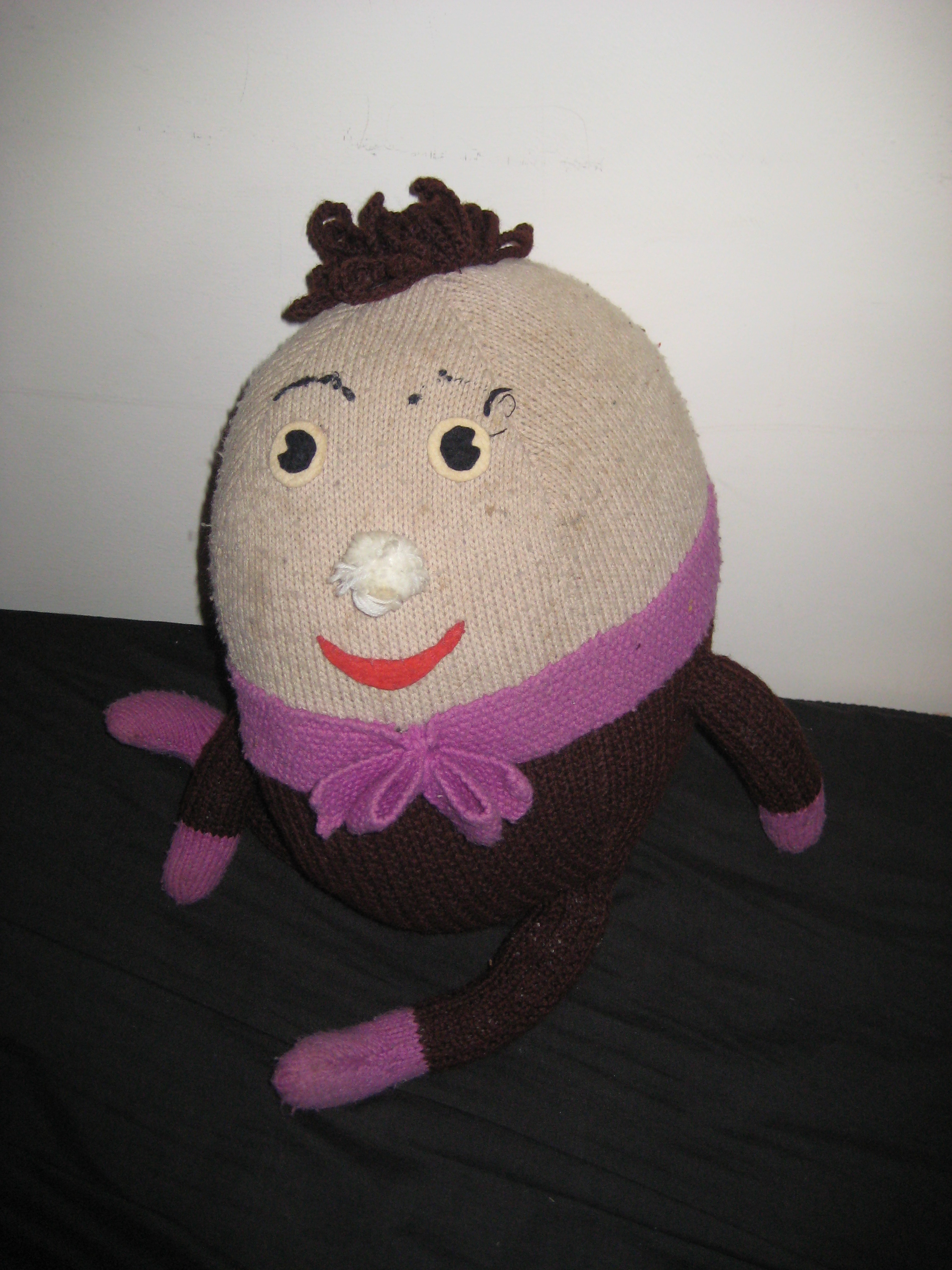 My Humpty is not the original Humpty. The original Humpty was an egg, whereas my Humpty is an egg-shaped soft toy made of wool. My Humpty is better because when he sits on a wall, even if he subsequently has a great fall, he doesn’t need any of the king’s horses or indeed any of the king’s men to put him together again.