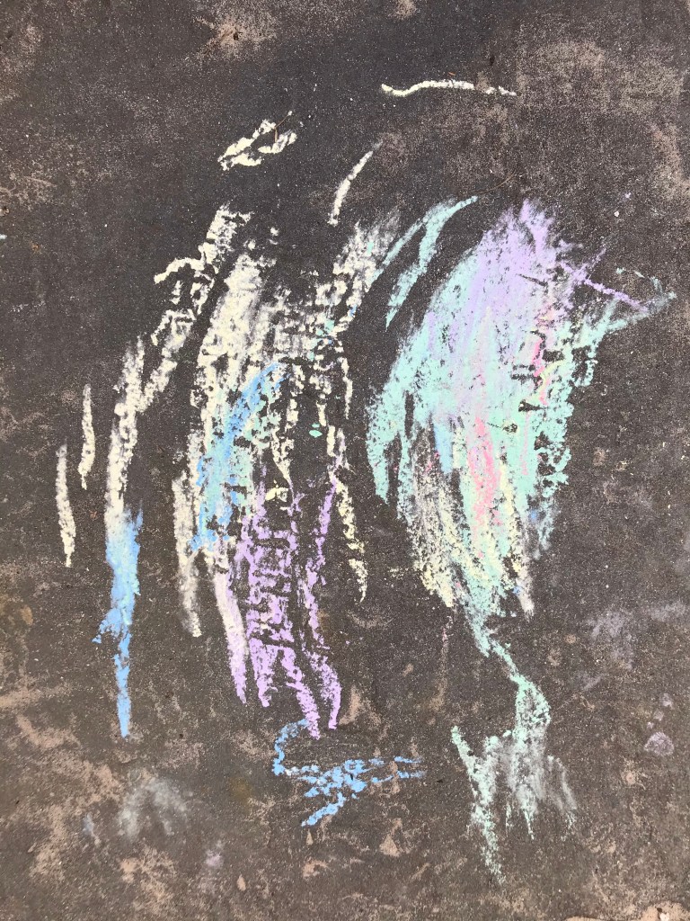 However, Little Proclaims wanted to continue. I mean her actual motivation is questionable given that she has no idea what a blog is, but she elected to be unwell this weekend just gone and because of the current climate, even though it was clearly just a common cold that ailed her, I felt it unwise to take her out in public. Trapped indoors on Sunday morning, she proved quite productive in her artistic endeavours, so much so that I have no end of pieces to share with the blogosphere. I’ll be dubbing them ‘The September Sessions’ and hopefully I’ll be posting the first of those next week. However, due to technical difficulties I’ve been unable to scan any of them for this week so instead I’ll share a different project from August when Little Proclaims was working in a new medium thanks to some oversized chalks she had for her birthday.
