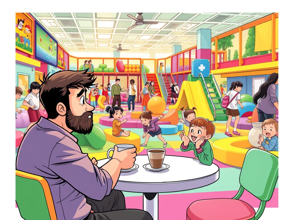 I am sitting at a table in my local leisure centre, while my children run around in the massive soft play area therein. We have paid the appropriate fees for the privilege although there is absolutely no effort made by the staff at the centre to police this, so I’m often vaguely suspicious that not all of the other patrons have parted with any cash.